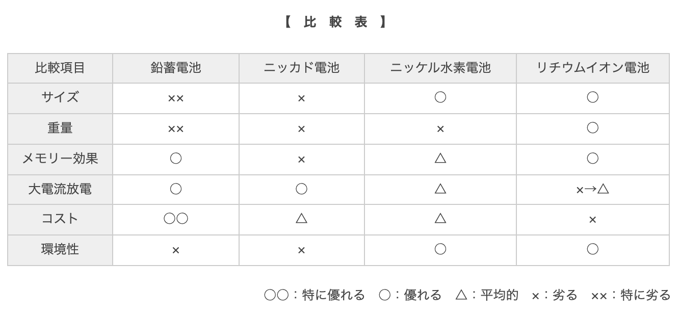 その後、似たような特性を有するニッケル水素電池が登場し、1990年代には現在主流となっているリチウムイオン電池が登場しました。